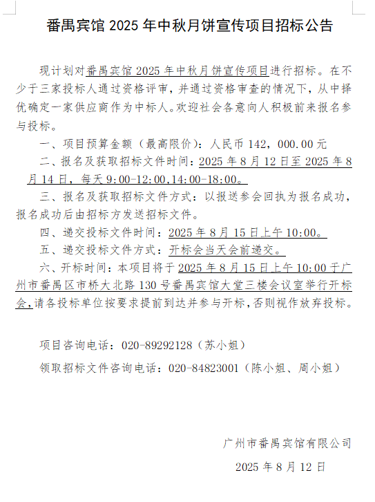 番禺賓館2025年中秋月餅宣傳項目招標公告