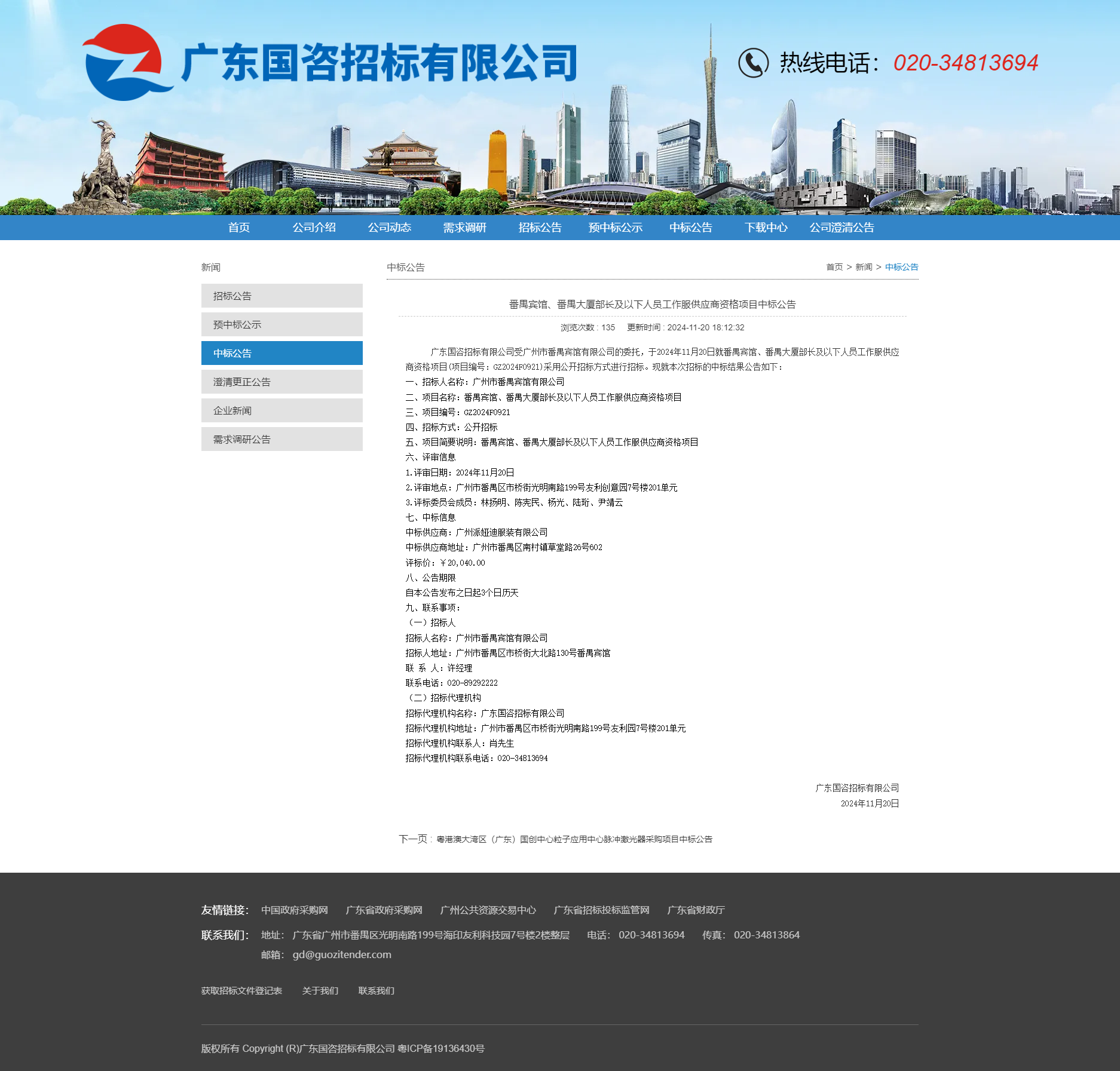 番禺賓館、番禺大廈部長及以下人員工作服供應商資格項目中標公告 發布日期:2024-11-20 分享: 詳情請查詢廣東國咨招標有限公司官網:https://www.guozitender.com/ 下一篇: 番禺賓館采購一輛公務車輛項目招標公告 返回