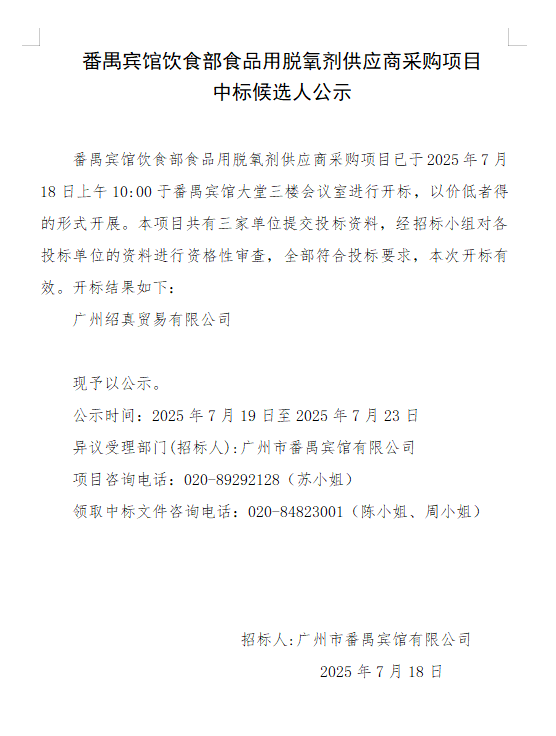 番禺賓館飲食部食品用脫氧劑供應商采購項目中標候選人公示