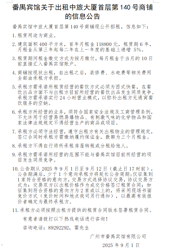 番禺賓館關于出租中旅大廈首層第140號商鋪的信息公告