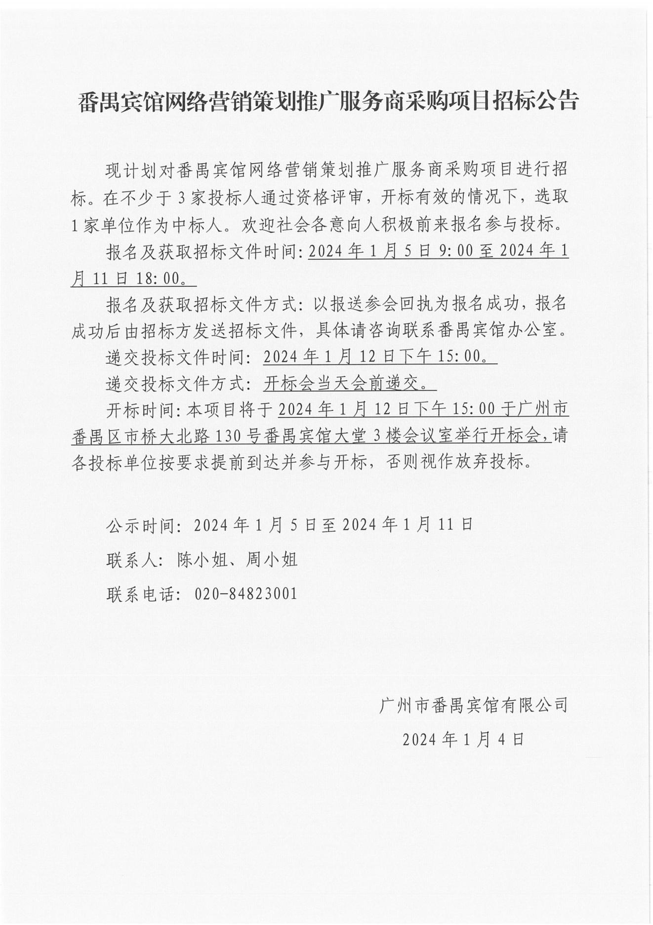 番禺賓館網(wǎng)絡(luò)營銷策劃推廣服務(wù)商采購項目招標公告 發(fā)布日期:2024-01-04 分享: 下一篇: 2024-2025年番禺賓館、番禺大廈餐飲食材(糧油類)供應(yīng)商資格采購項目失敗結(jié)果公示 返回