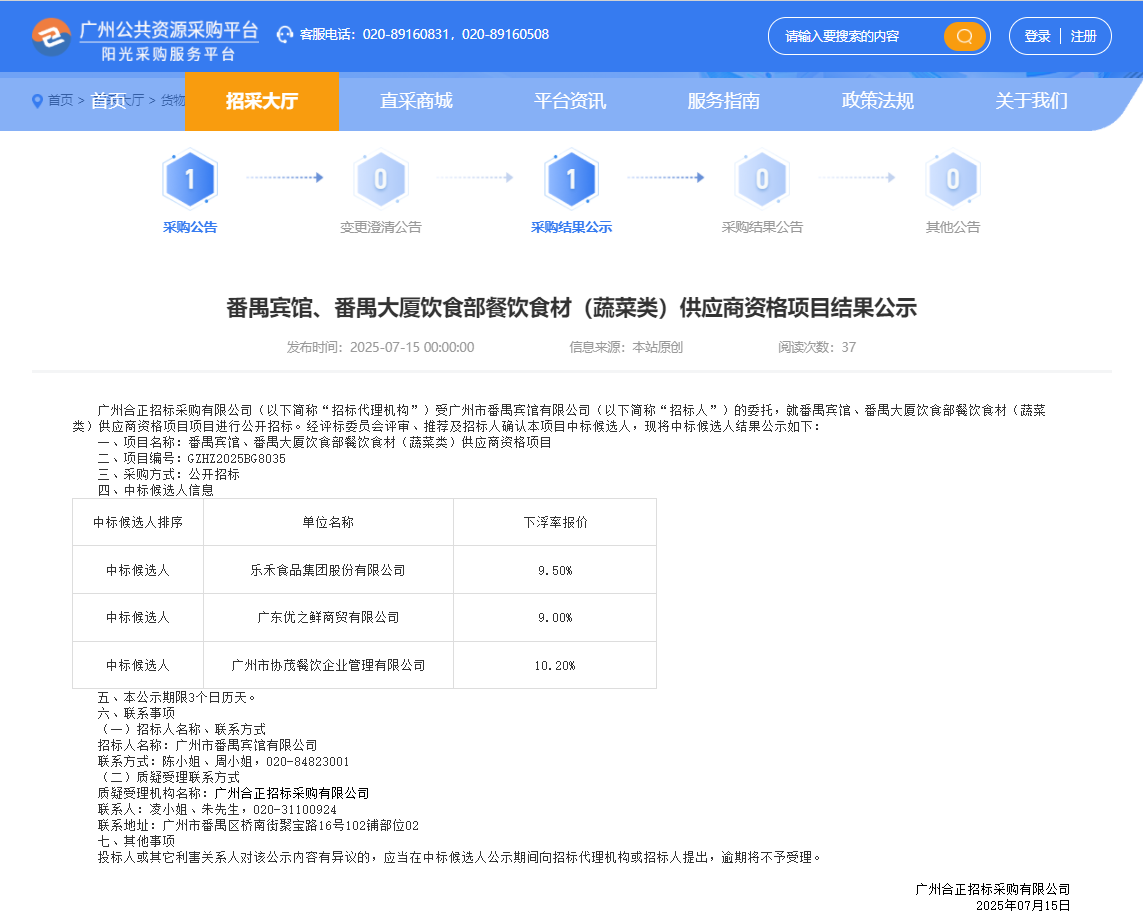 番禺賓館、番禺大廈飲食部餐飲食材(蔬菜類)供應商資格項目結果公示