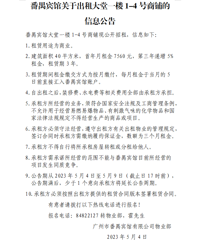 番禺賓館關于出租大堂一樓1-4號商鋪的信息公告