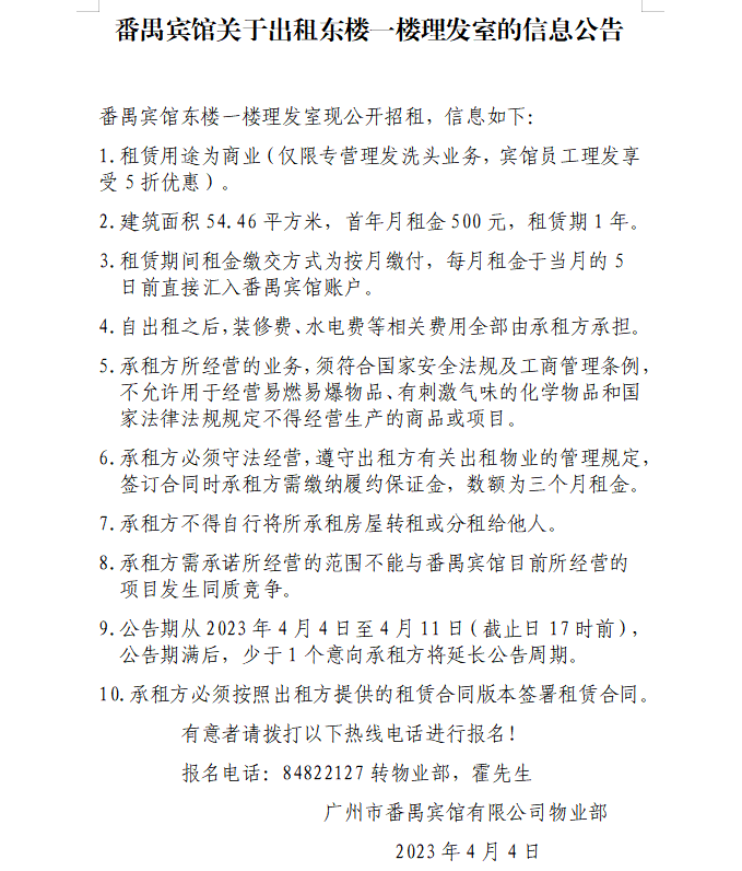 番禺賓館關于出租東樓一樓理發室的信息公告