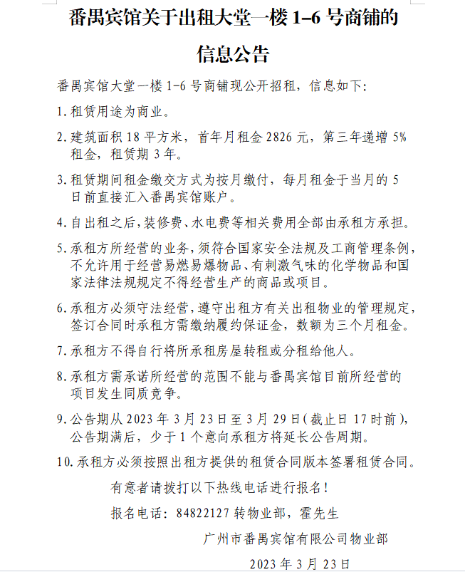 番禺賓館關于出租大堂一樓1-6號商鋪的信息公告