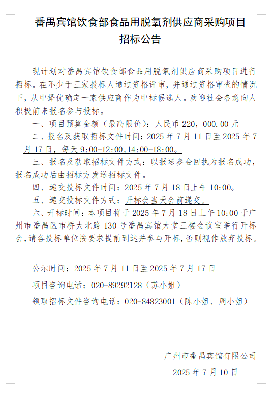番禺賓館飲食部食品用脫氧劑供應商采購項目招標公告