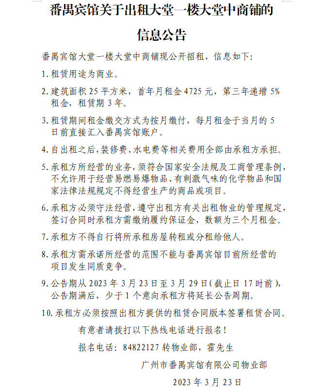 番禺賓館關于出租大堂二樓2-3號商鋪的信息公告