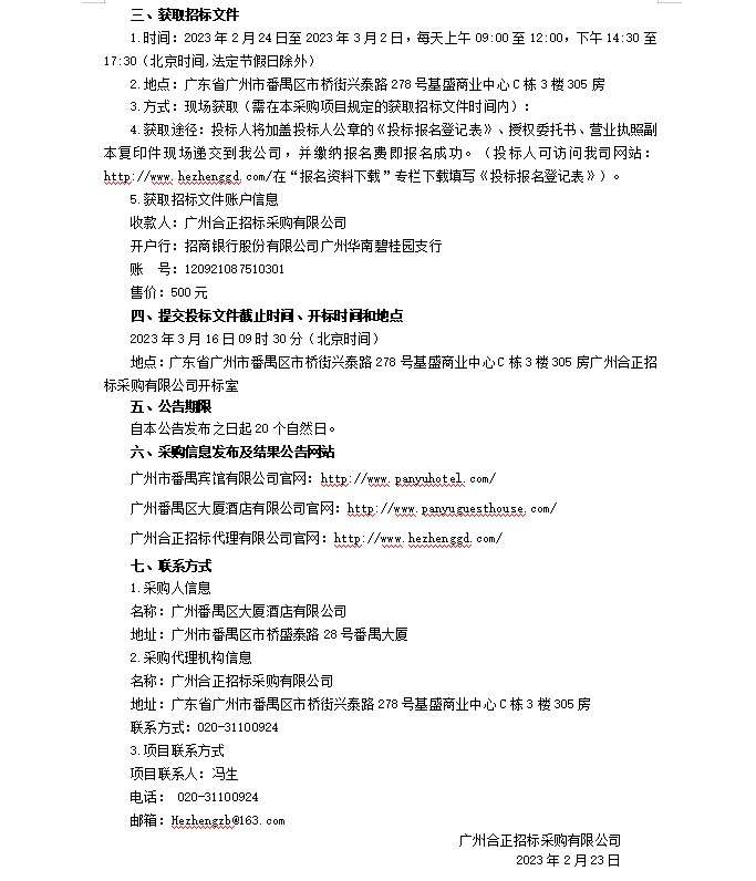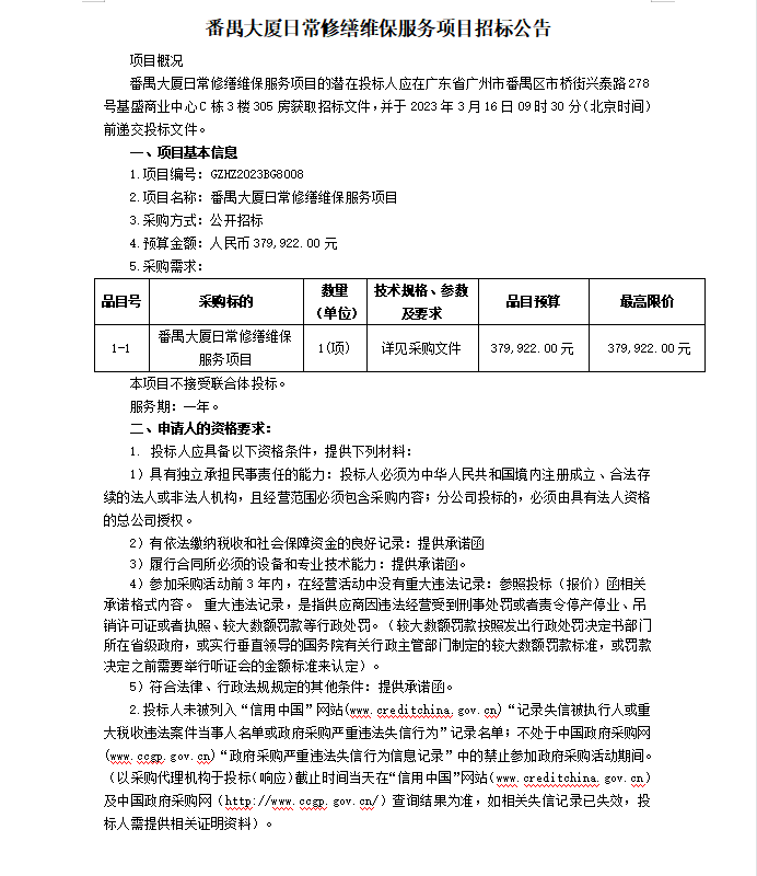 番禺大廈日常修繕維保服務項目招標公告 發布日期:2023-02-23 分享: 詳情可查詢廣州合正招標采購有限公司官網http://www.hezhenggd.com/ 下一篇: 番禺賓館關于出租大堂二樓2-11號商鋪的信息公告 返回