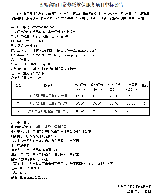 番禺賓館日常修繕維保服務(wù)項(xiàng)目中標(biāo)公告 發(fā)布日期:2023-01-20 分享: 番禺賓館日常修繕維保服務(wù)項(xiàng)目中標(biāo)公告詳情可查詢廣州合正招標(biāo)代理有限公司官網(wǎng):http://www.hezhenggd.com/ 下一篇: 番禺賓館關(guān)于出租大堂二樓2-9號(hào)商鋪的信息公告 返回