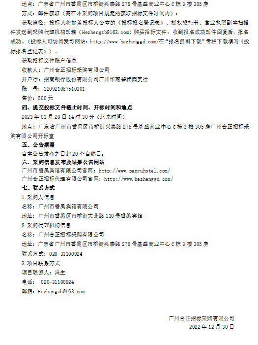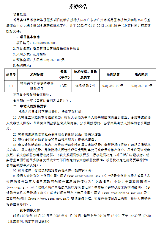 番禺賓館日常修繕維保服務項目招標公告 發布日期:2022-12-30 分享: 番禺賓館日常修繕維保服務項目招標公告詳情可查詢廣州合正招標代理有限公司官網:http://www.hezhenggd.com/ 下一篇: 番禺賓館除“四害”服務商采購項目中標候選人公示 返回