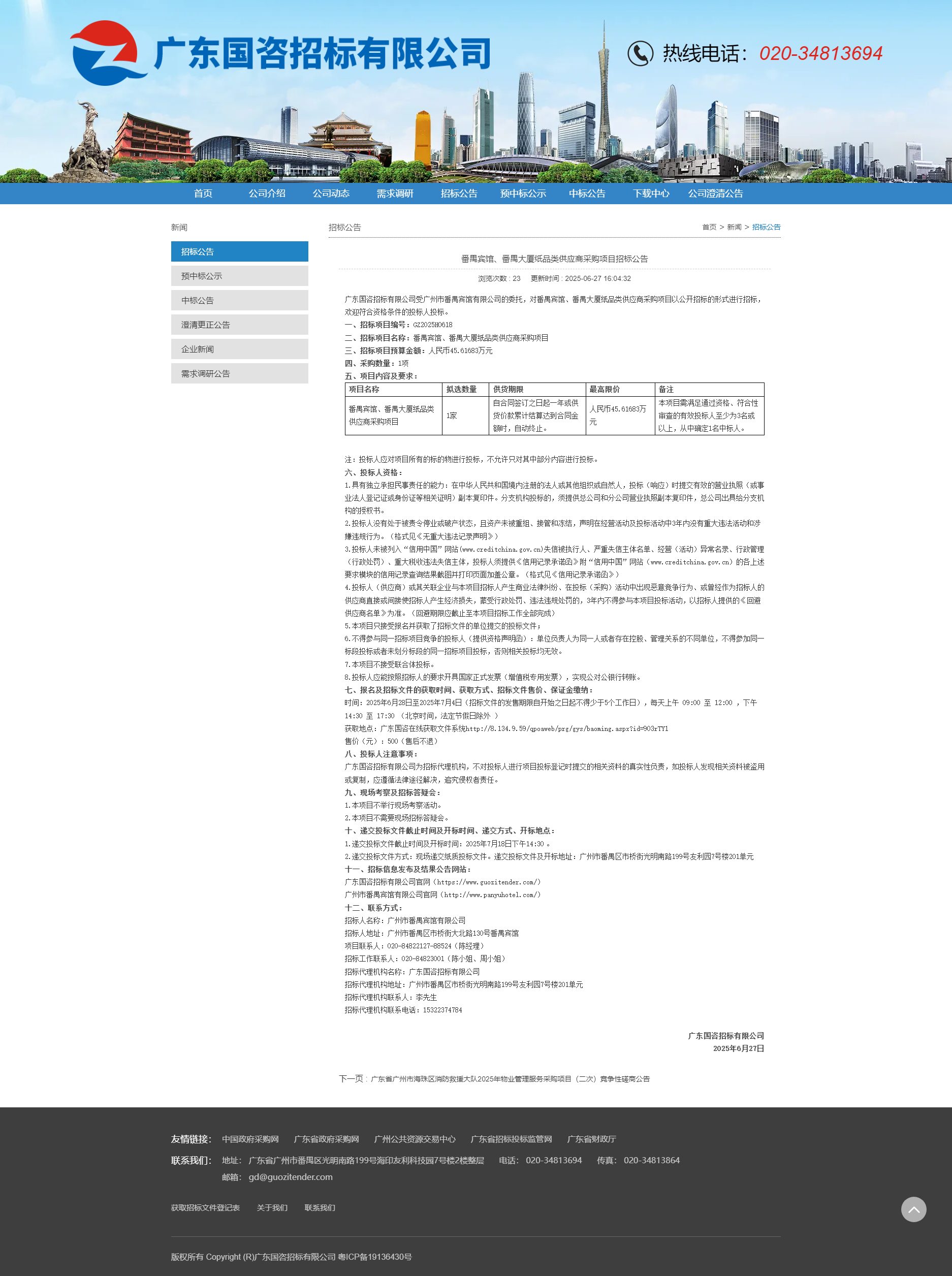 番禺賓館、番禺大廈紙品類供應(yīng)商采購(gòu)項(xiàng)目招標(biāo)公告 發(fā)布日期:2025-06-27 分享: 詳情請(qǐng)查詢廣東國(guó)咨招標(biāo)有限公司官網(wǎng):https://guozitender.com 下一篇: 【黨建學(xué)習(xí)】加快建設(shè)文化強(qiáng)國(guó),總書記作出五方面部署 返回