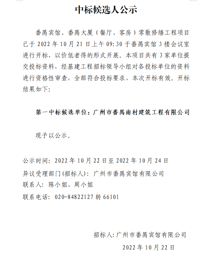 番禺賓館、番禺大廈(餐廳、客房)零散修繕工程項(xiàng)目中標(biāo)候選人公示 發(fā)布日期:2022-10-21 分享: 下一篇: 番禺賓館、番禺大廈工程造價(jià)咨詢單位資格采購項(xiàng)目中標(biāo)候選人公示 返回