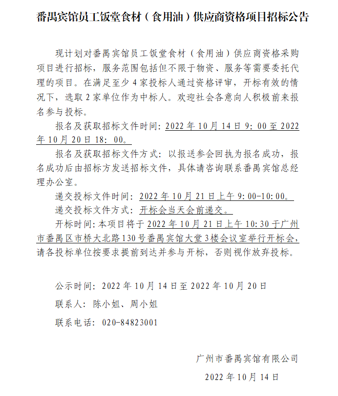 番禺賓館員工飯?zhí)檬巢模ㄊ秤糜停┕?yīng)商資格采購項目招標(biāo)公告 發(fā)布日期:2022-10-14 分享: 下一篇: 番禺賓館關(guān)于出租中旅大廈首層146號(之一)商鋪的信息公告 返回