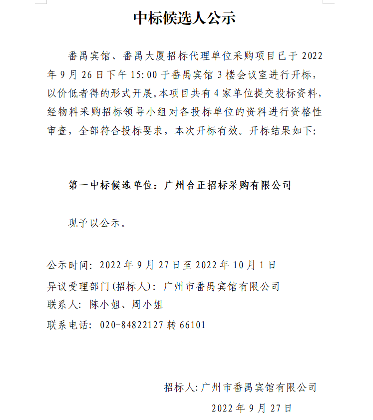 番禺賓館、番禺大廈招標代理單位項目中標候選人公示
