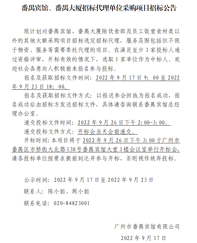 番禺賓館、番禺大廈招標代理單位采購項目招標公告