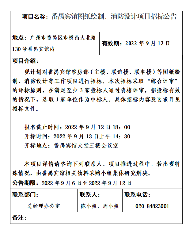 番禺賓館圖紙繪制、消防設計項目招標公告