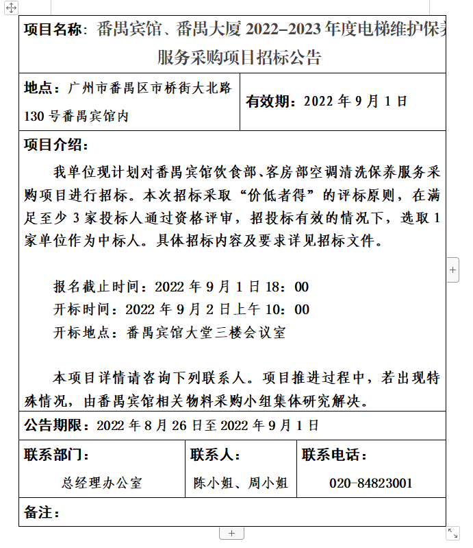 番禺賓館、番禺大廈2022-2023年度電梯維護保養服務采購項目招標公告