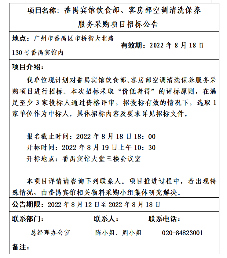 番禺賓館飲食部、客房部空調(diào)清洗保養(yǎng) 服務采購項目招標公告