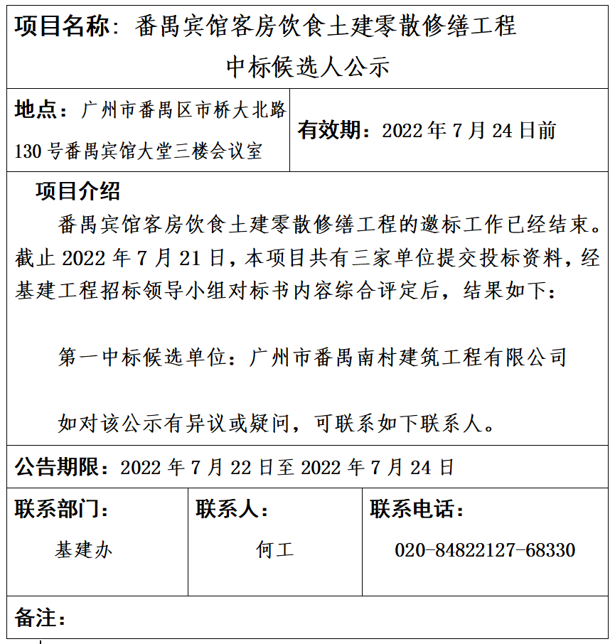 番禺賓館客房飲食土建零散修繕工程中標候選人公示