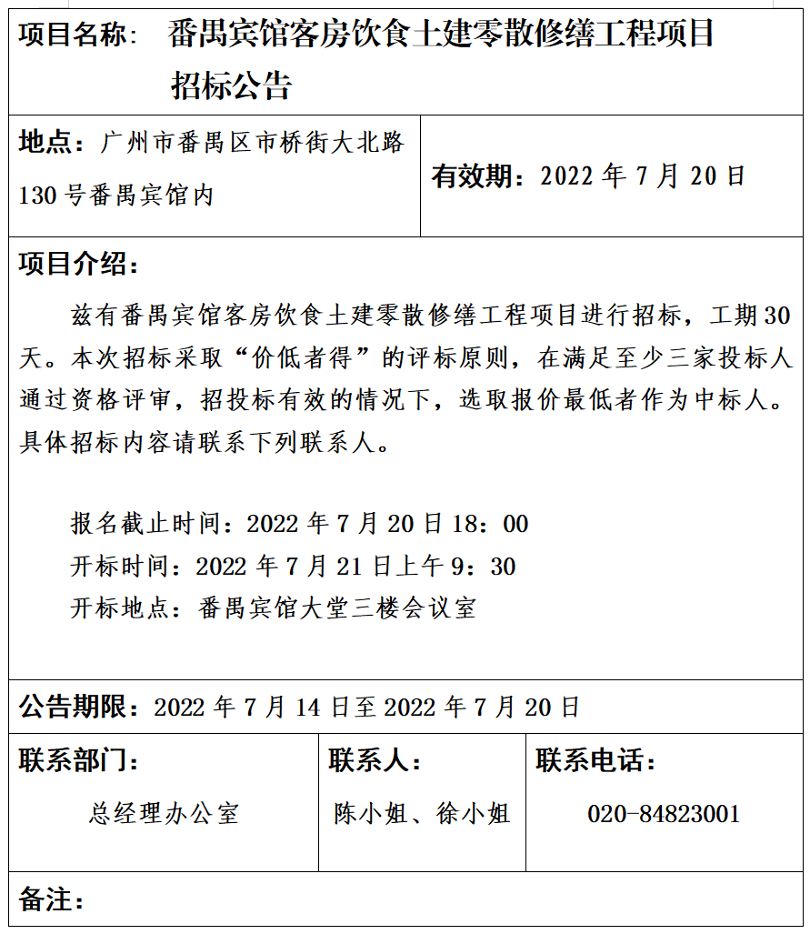 番禺賓館客房飲食土建零散修繕工程項目招標公告