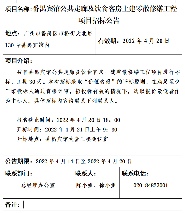 番禺賓館公共走廊及飲食客房土建零散修繕工程項(xiàng)目招標(biāo)公告 發(fā)布日期:2022-04-13 分享: 下一篇: 番禺賓館、番禺大廈弱電系統(tǒng)設(shè)備供應(yīng)商資格采購(gòu)項(xiàng)目中標(biāo)候選人公示 返回