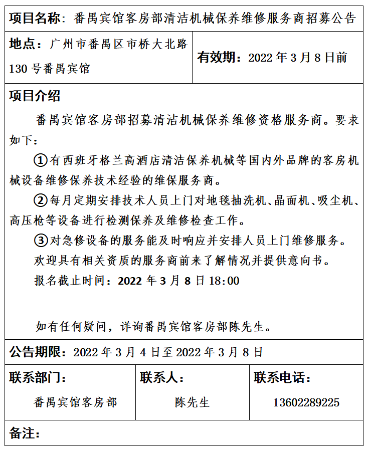 番禺賓館客房部清潔機(jī)械保養(yǎng)維修服務(wù)商招募公告 發(fā)布日期:2022-03-03 分享: 下一篇: 番禺賓館關(guān)于出租大堂二樓2-6號(hào)商鋪的信息公告 返回