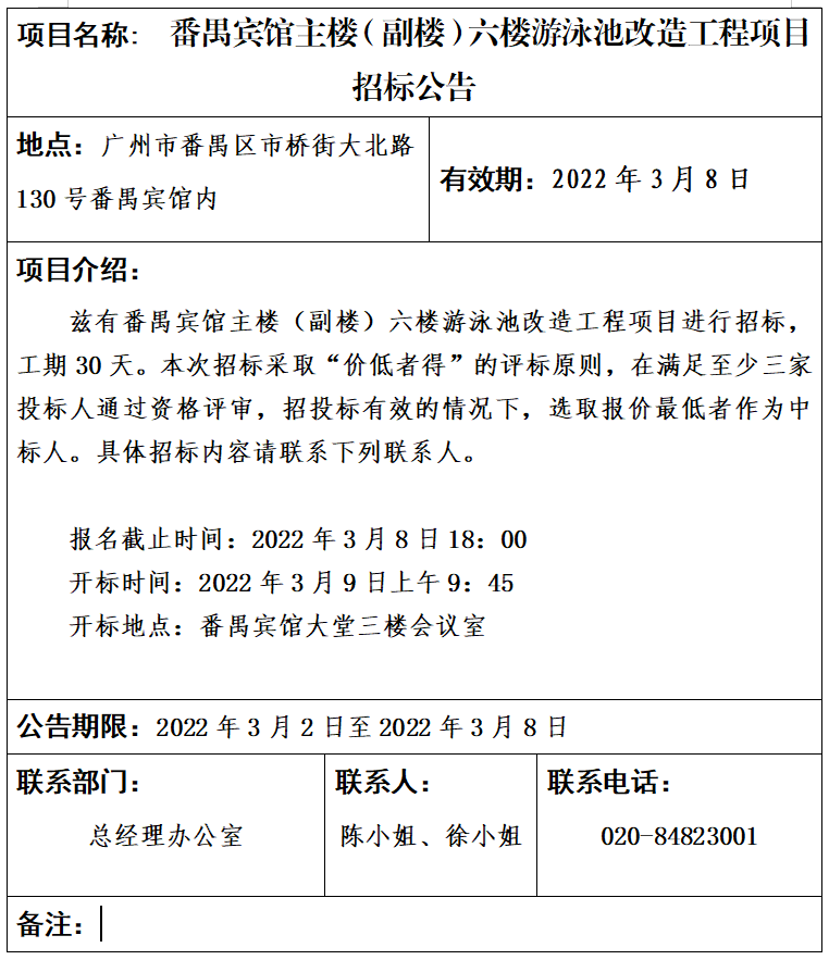 番禺賓館主樓(副樓)六樓游泳池改造工程項目招標公告