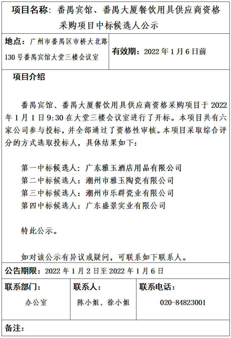 番禺賓館、番禺大廈餐飲用具供應商資格采購項目中標候選人公示