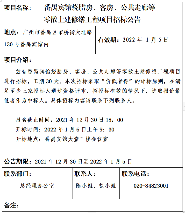 番禺賓館燒臘房、客房、公共走廊等零散土建修繕工程項目招標公告