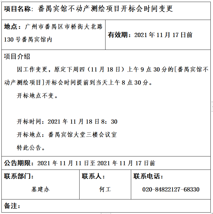 番禺賓館不動產(chǎn)測繪項目開標會時間變更 發(fā)布日期:2021-11-11 分享: 下一篇: 中國飯店協(xié)會秘書長丁志剛對番禺賓館古耀堅總經(jīng)理攜廚房團隊精心制作的十大廣州美食給予高度評價 返回