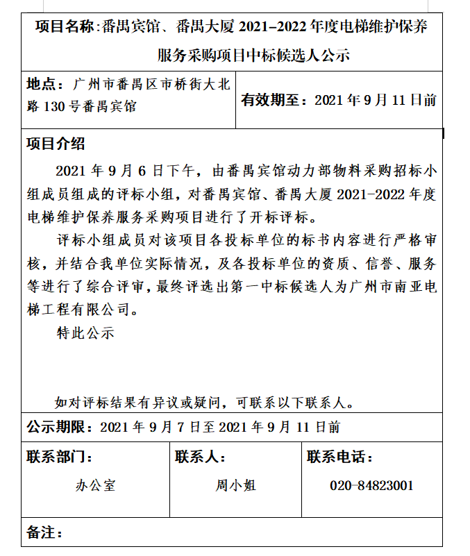 番禺賓館、番禺大廈2021-2022年度電梯維護保養服務采購項目中標候選人公示