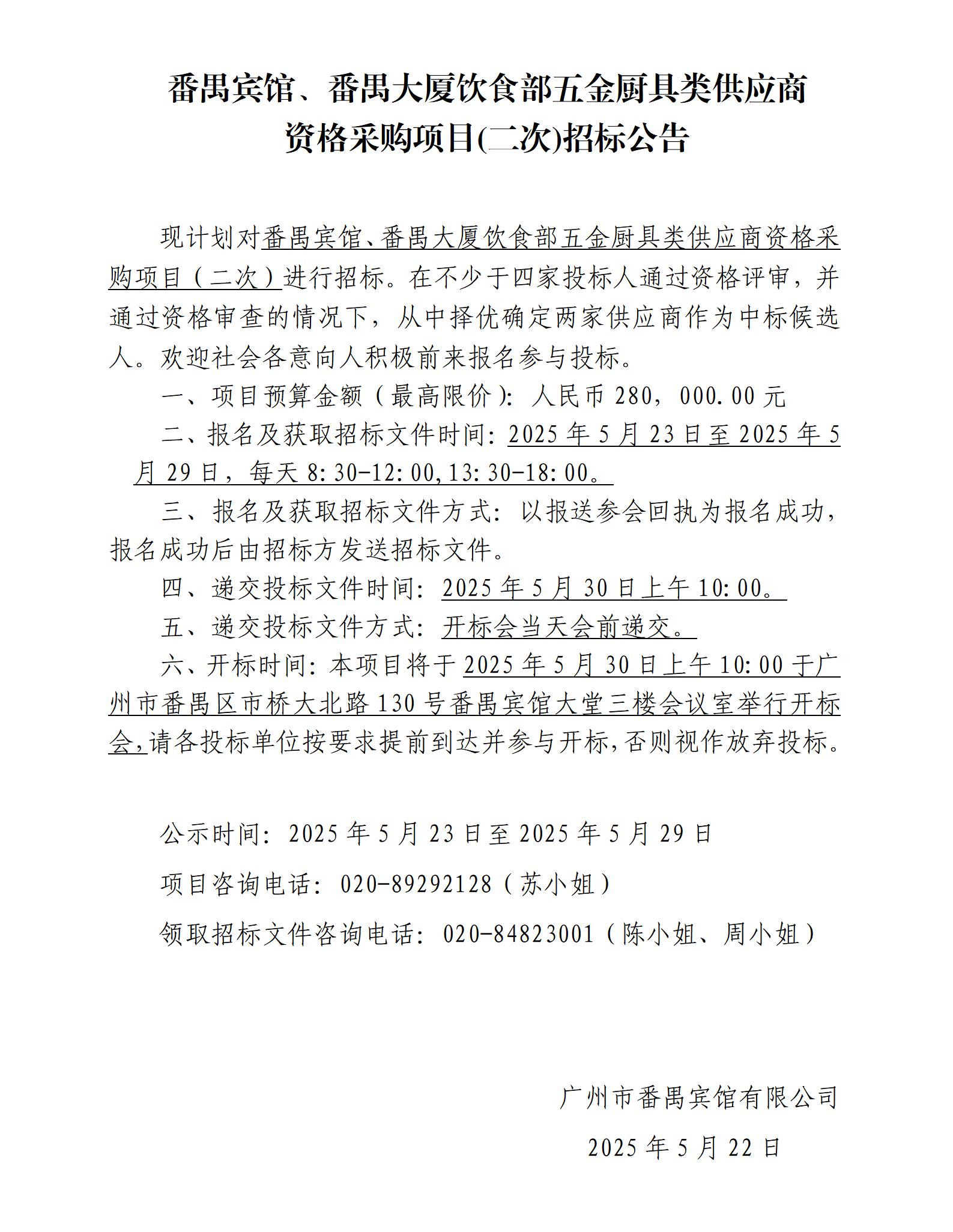 番禺賓館、番禺大廈飲食部五金廚具類供應商資格采購項目(二次)招標公告