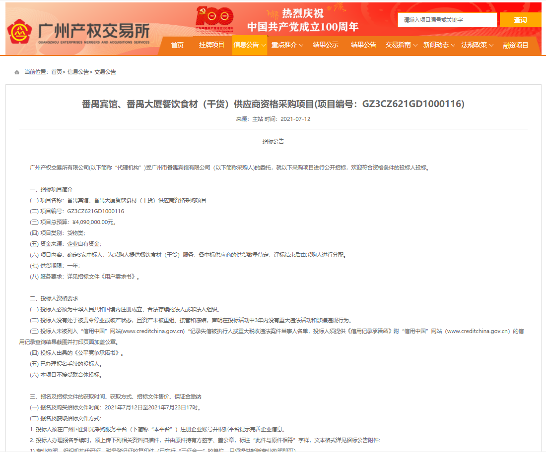 番禺賓館、番禺大廈餐飲食材(干貨)供應商資格采購項目招標公告