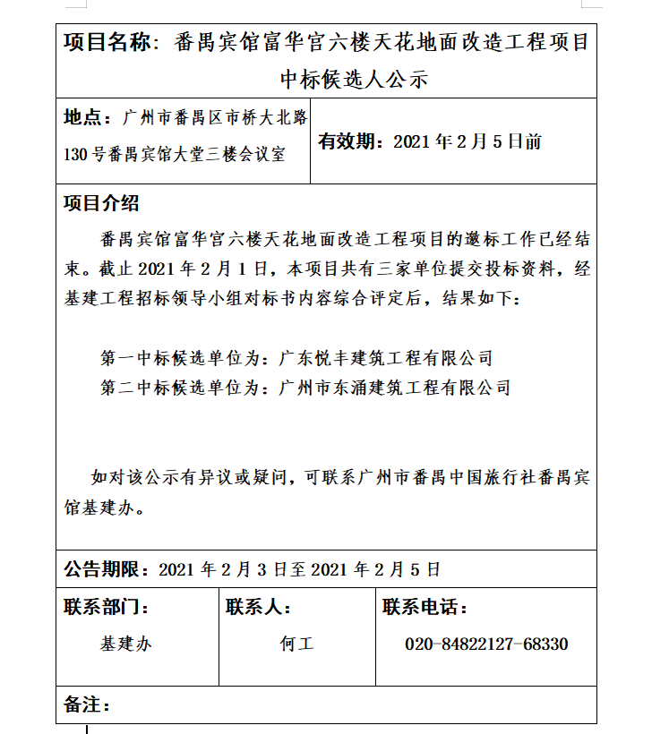 番禺賓館富華宮六樓天花地面改造工程項目中候選人公示