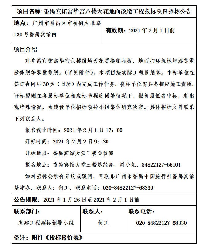 番禺賓館富華宮六樓天花地面改造工程項(xiàng)目招標(biāo)公告 發(fā)布日期:2021-01-26 分享: 下一篇: 番禺區(qū)大廈酒店餐廳客房后勤零散修繕工程項(xiàng)目招標(biāo)公告 返回