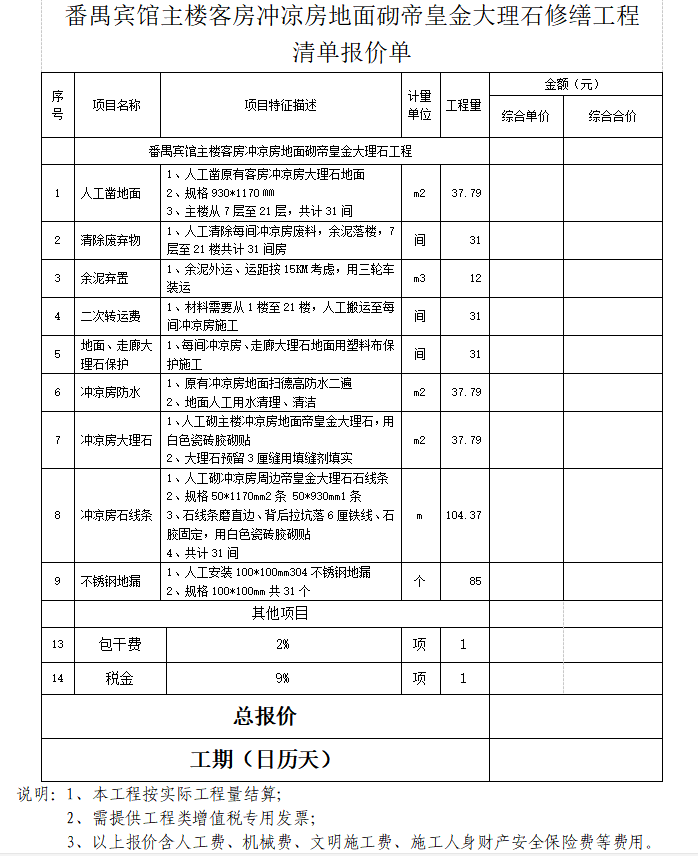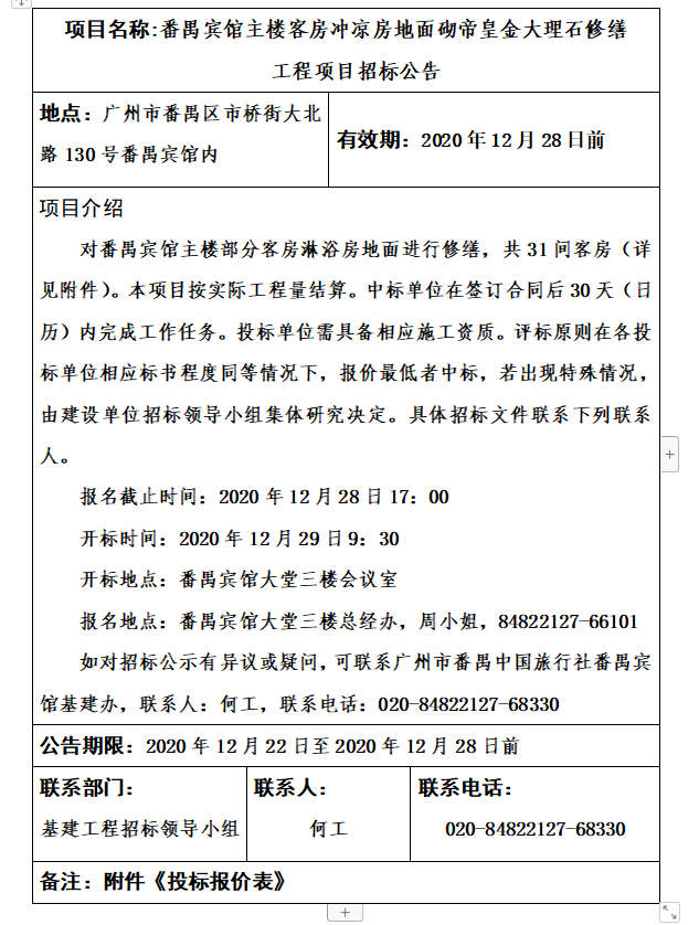 番禺賓館主樓客房沖涼房地面砌帝皇金大理石修繕工程項目招標工告