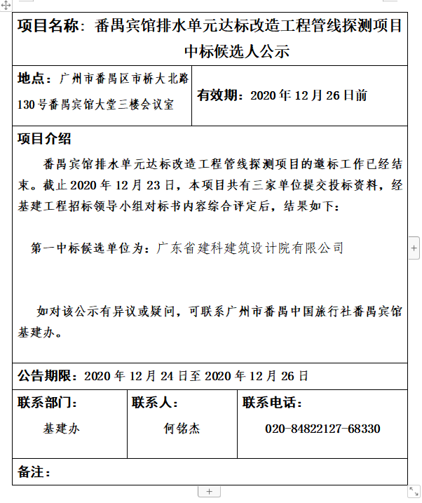 番禺賓館排水單元達標改造工程管線探測項目中標候選人公示