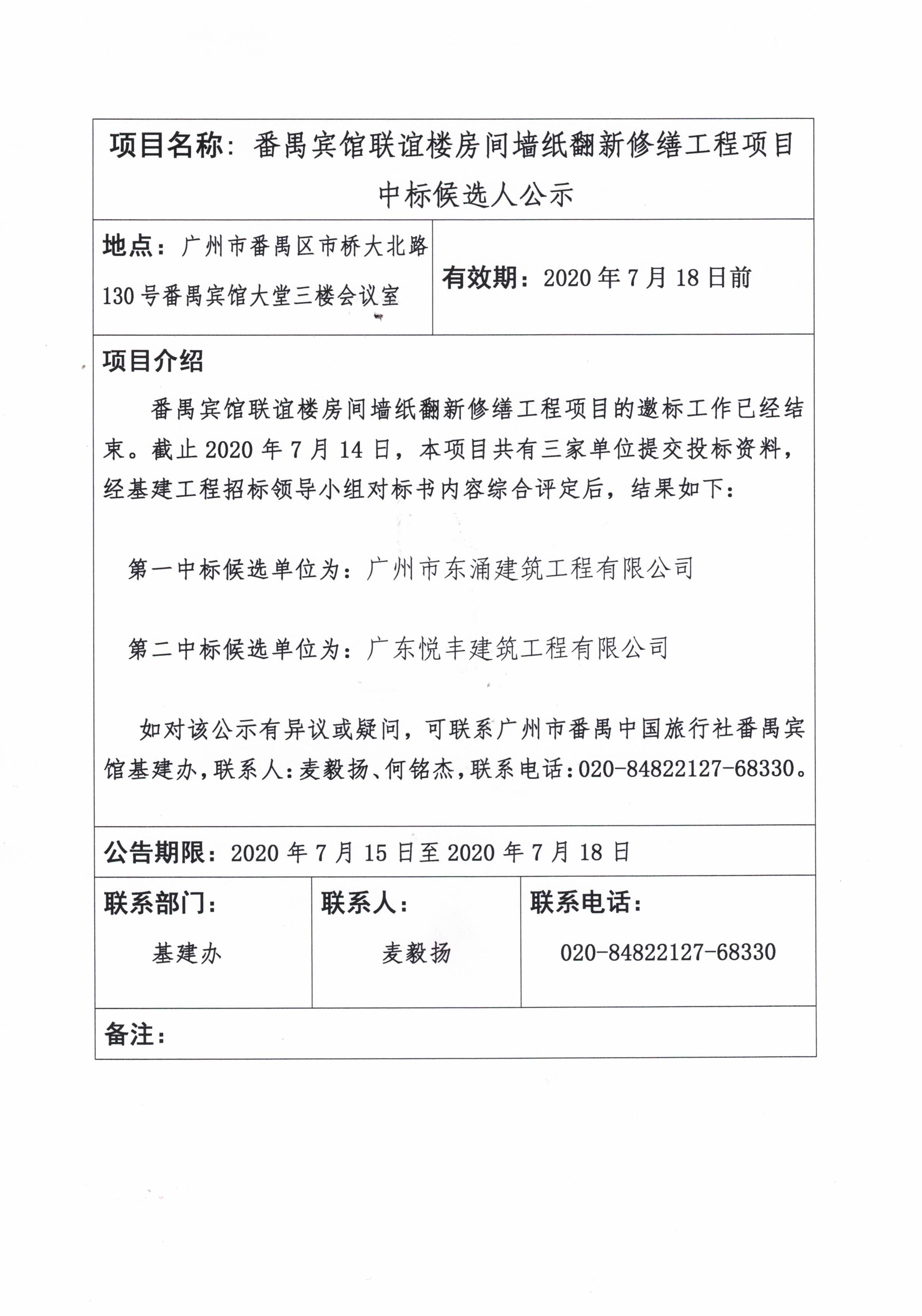 番禺賓館聯誼樓房間墻紙翻新修繕工程項目中標候選人公示