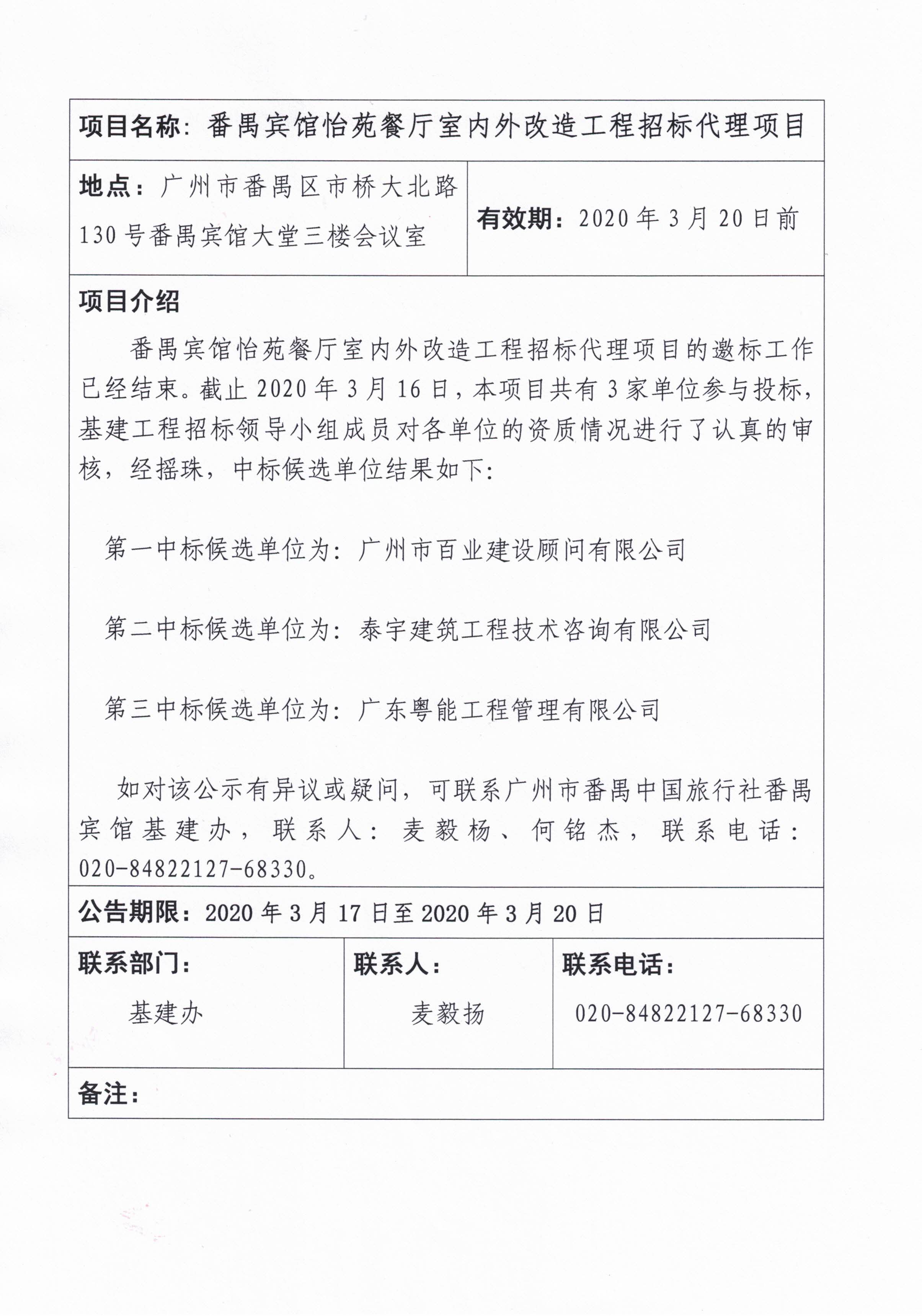 番禺賓館怡苑餐廳室內外改造工程招標代理項目中標候選人公示