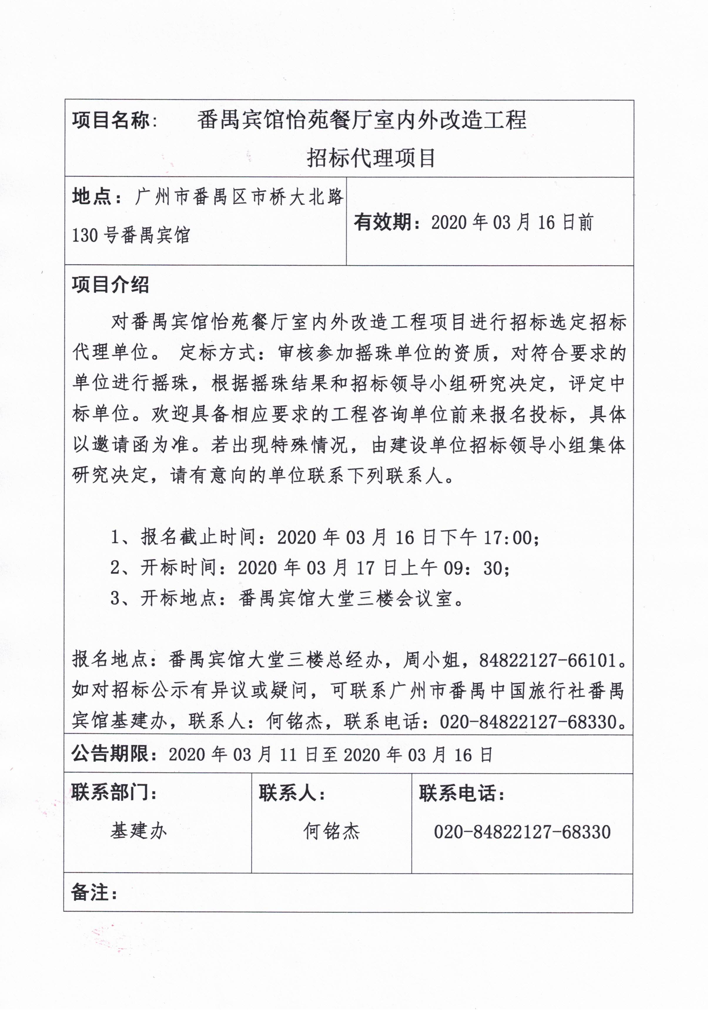 番禺賓館怡苑餐廳室內外改造工程招標代理項目招標公告