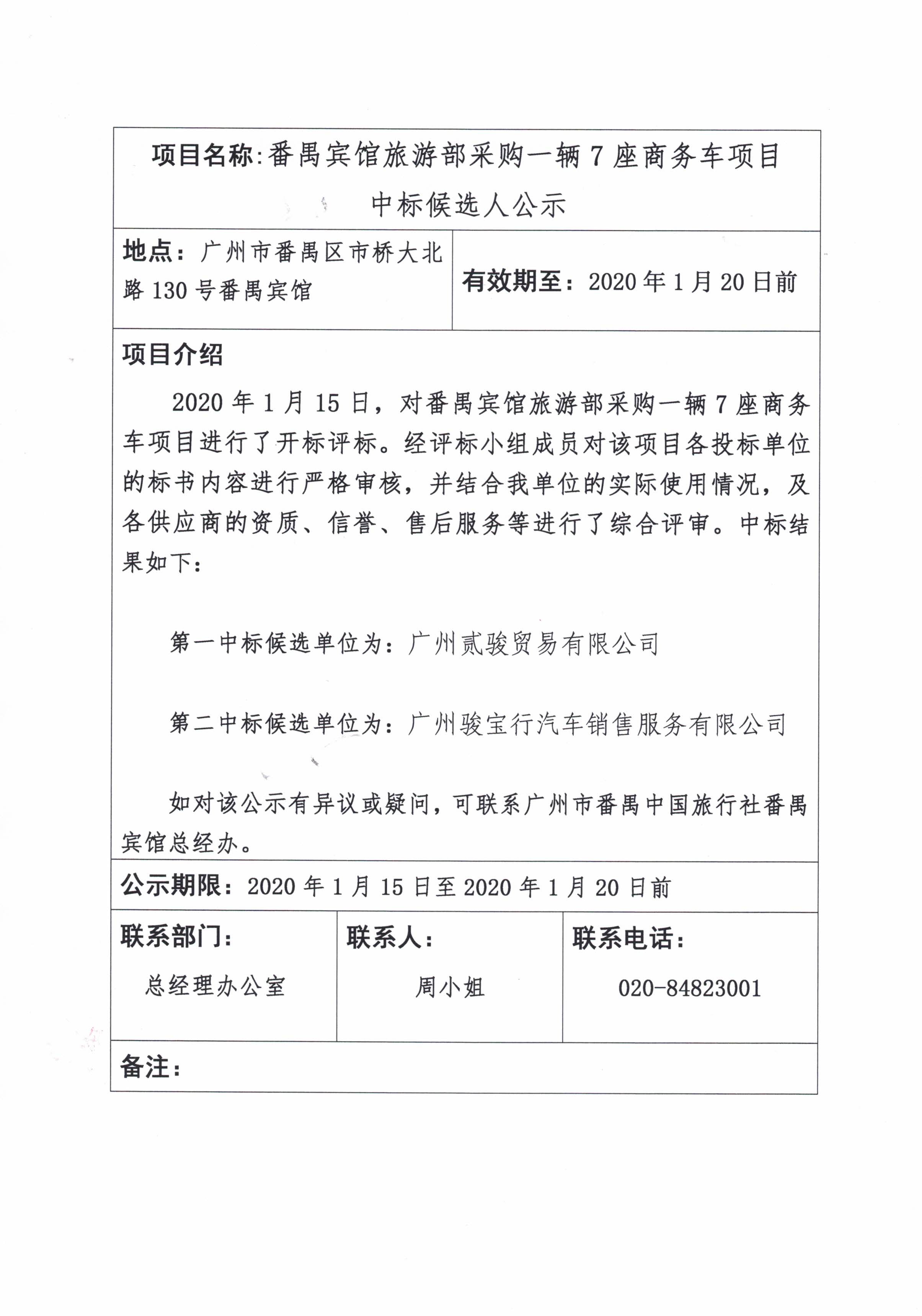 番禺賓館旅游部采購(gòu)一輛7座商務(wù)車項(xiàng)目中標(biāo)候選人公示 發(fā)布日期:2020-01-15 分享: 下一篇: 番禺賓館旅游部采購(gòu)一輛7座商務(wù)車項(xiàng)目招標(biāo)公告 返回