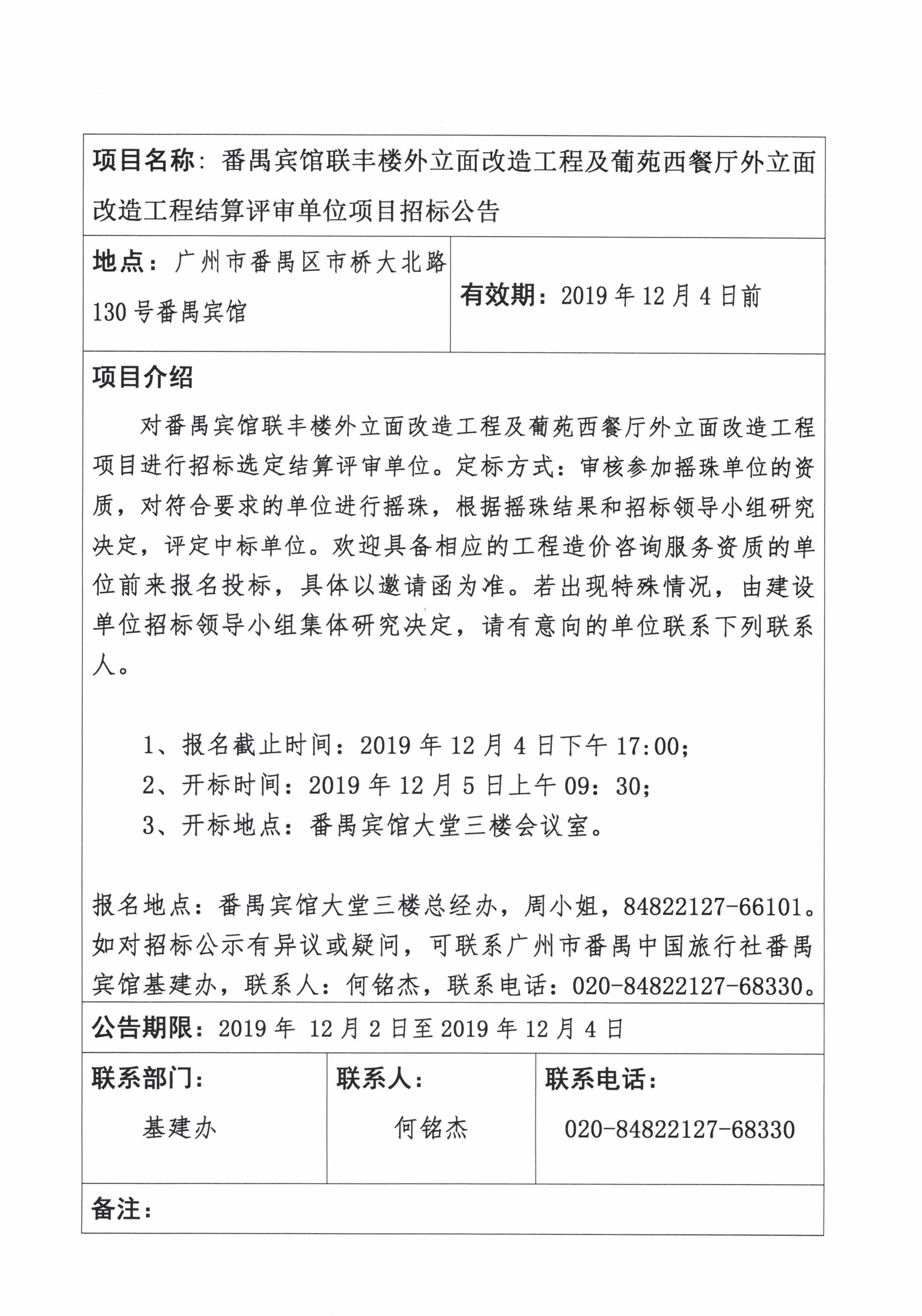番禺賓館聯豐樓外立面改造工程及葡苑西餐廳外立面改造工程結算評審單位項目招標公告