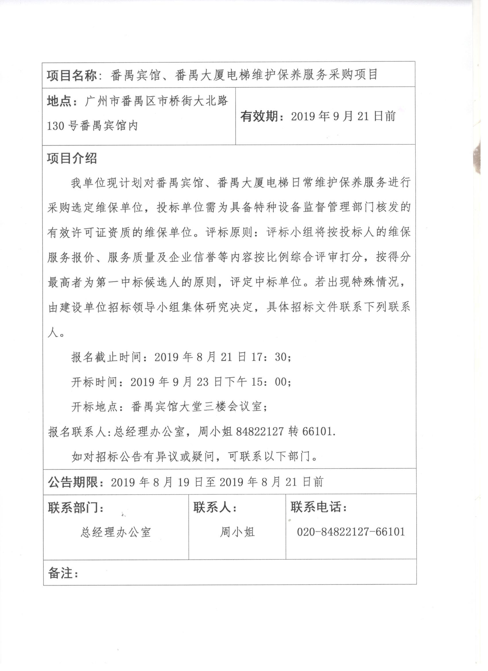 番禺賓館、番禺大廈電梯維護(hù)保養(yǎng)服務(wù)采購項(xiàng)目招標(biāo)公告 發(fā)布日期:2019-09-18 分享: 下一篇: 廣州大夫山酒店(擬用名)怡樂樓裝修工程設(shè)計(jì)項(xiàng)目 返回