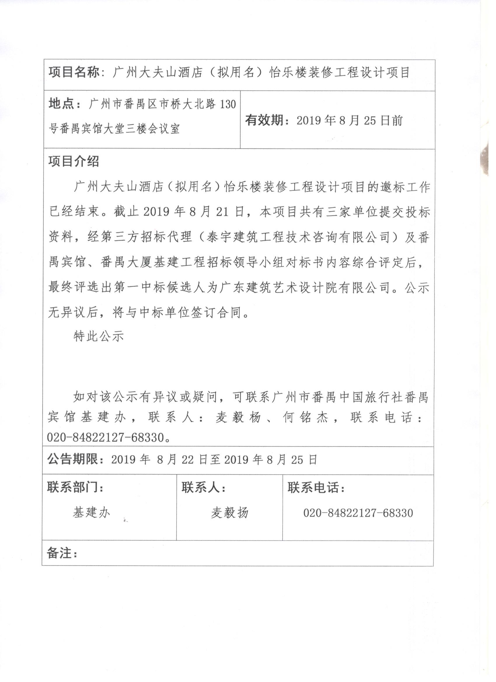 廣州大夫山酒店(擬用名)怡樂樓裝修工程項目設計招標公告