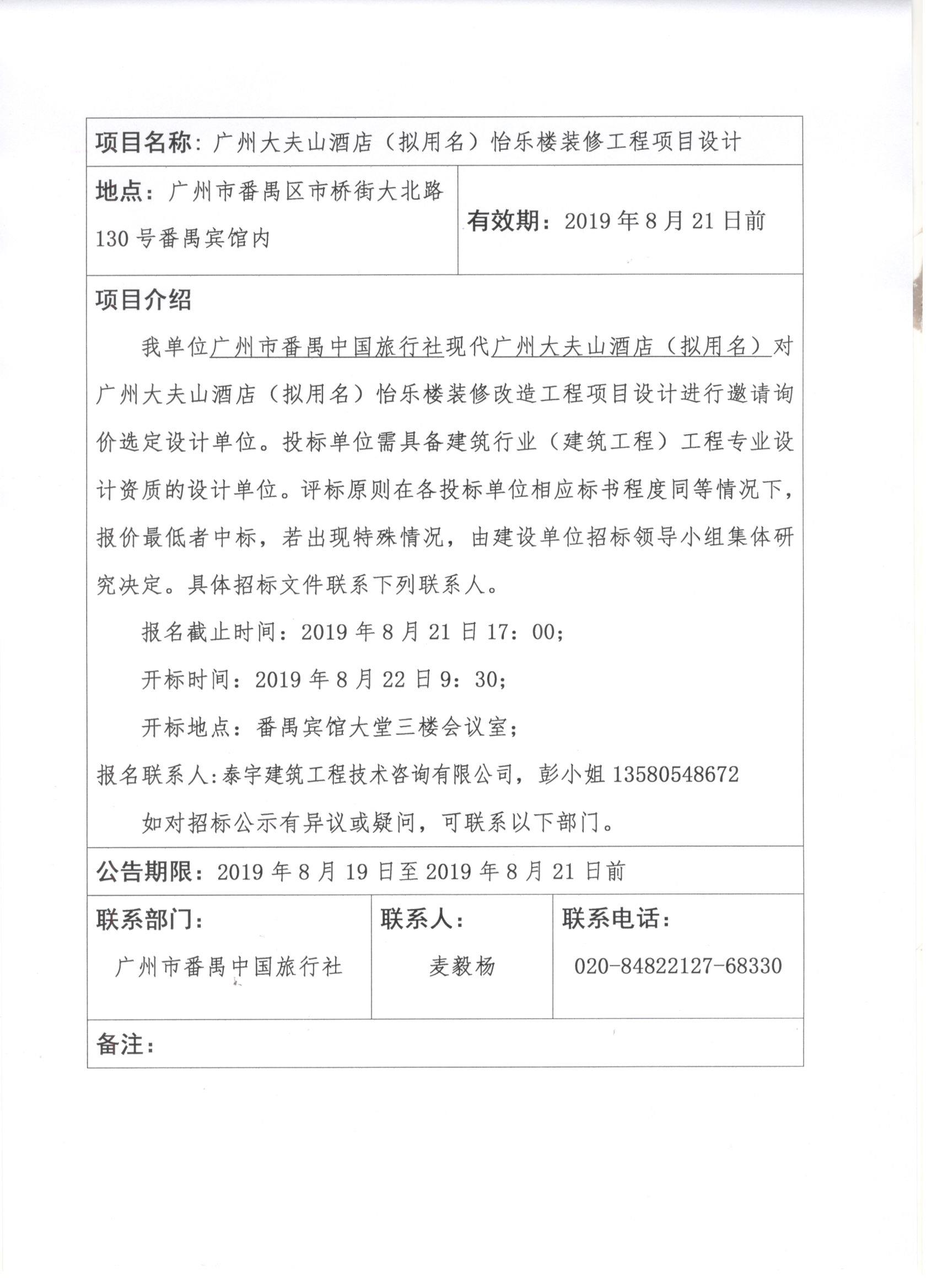 廣州大夫山酒店(擬用名)怡樂樓裝修工程項目設計招標公告