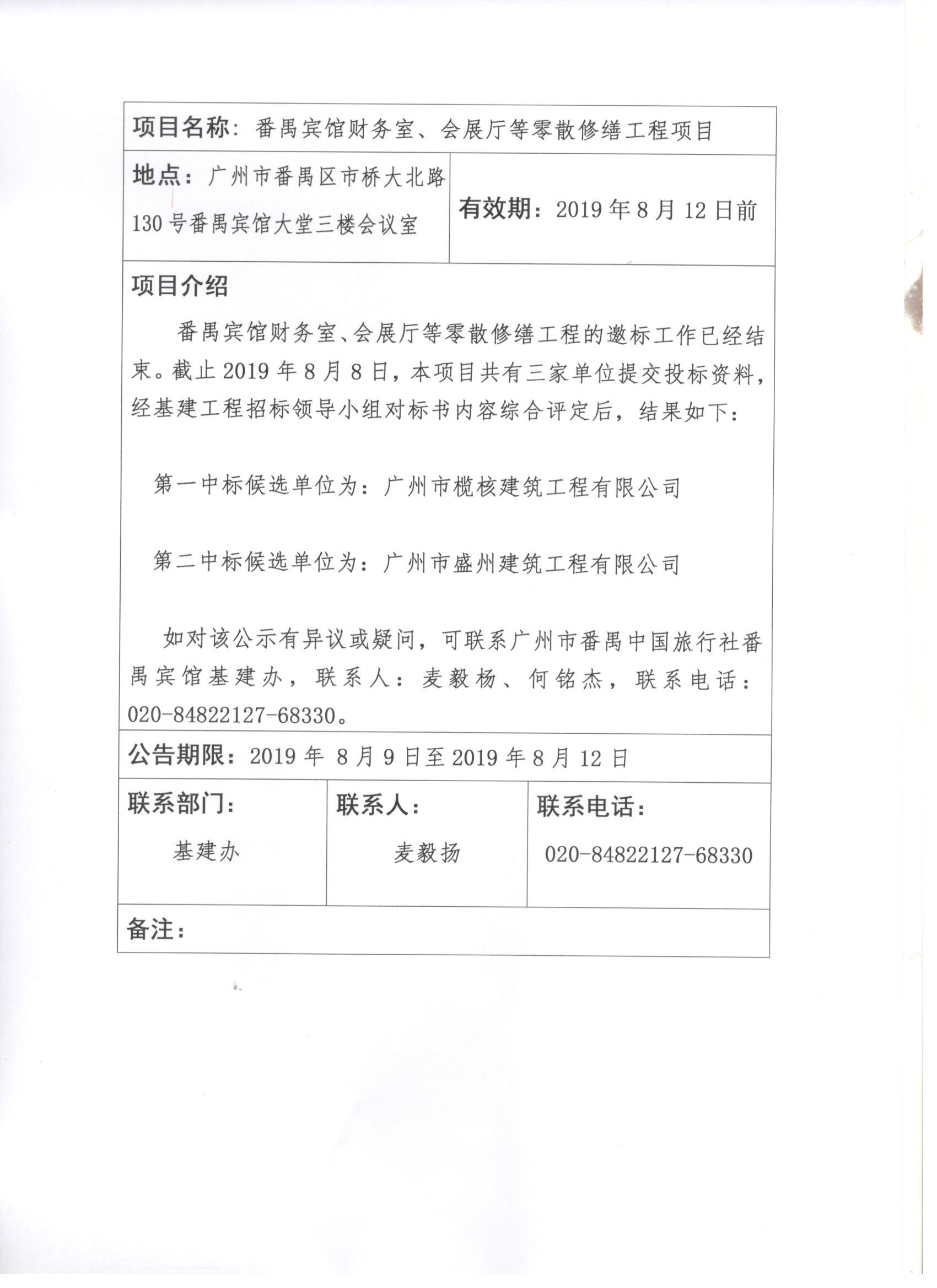 番禺賓館財務室、會展廳等零散修繕工程項目中標候選人公示