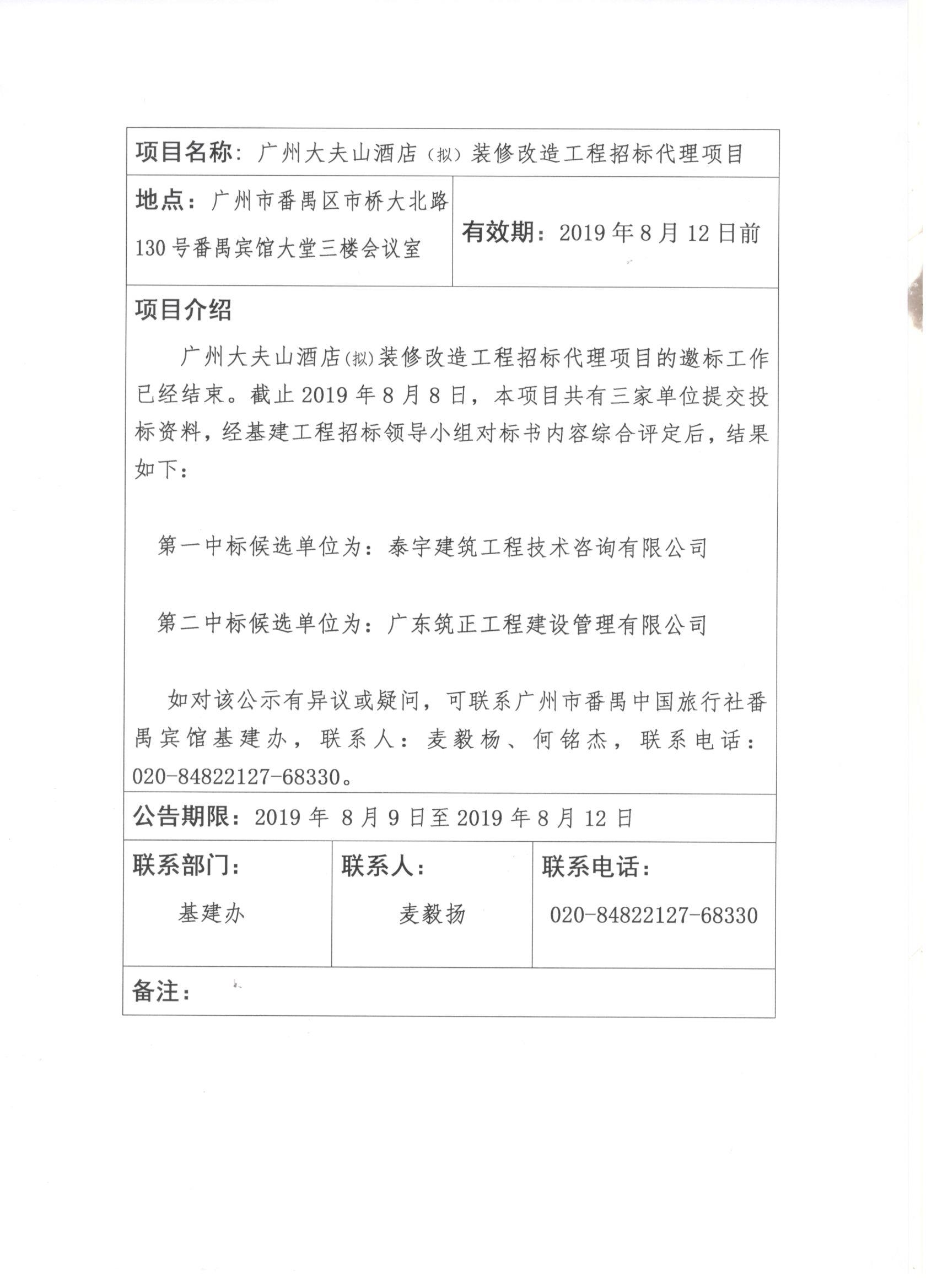 廣州大夫山酒店(擬)裝修改造工程招標代理項目中標候選人公示