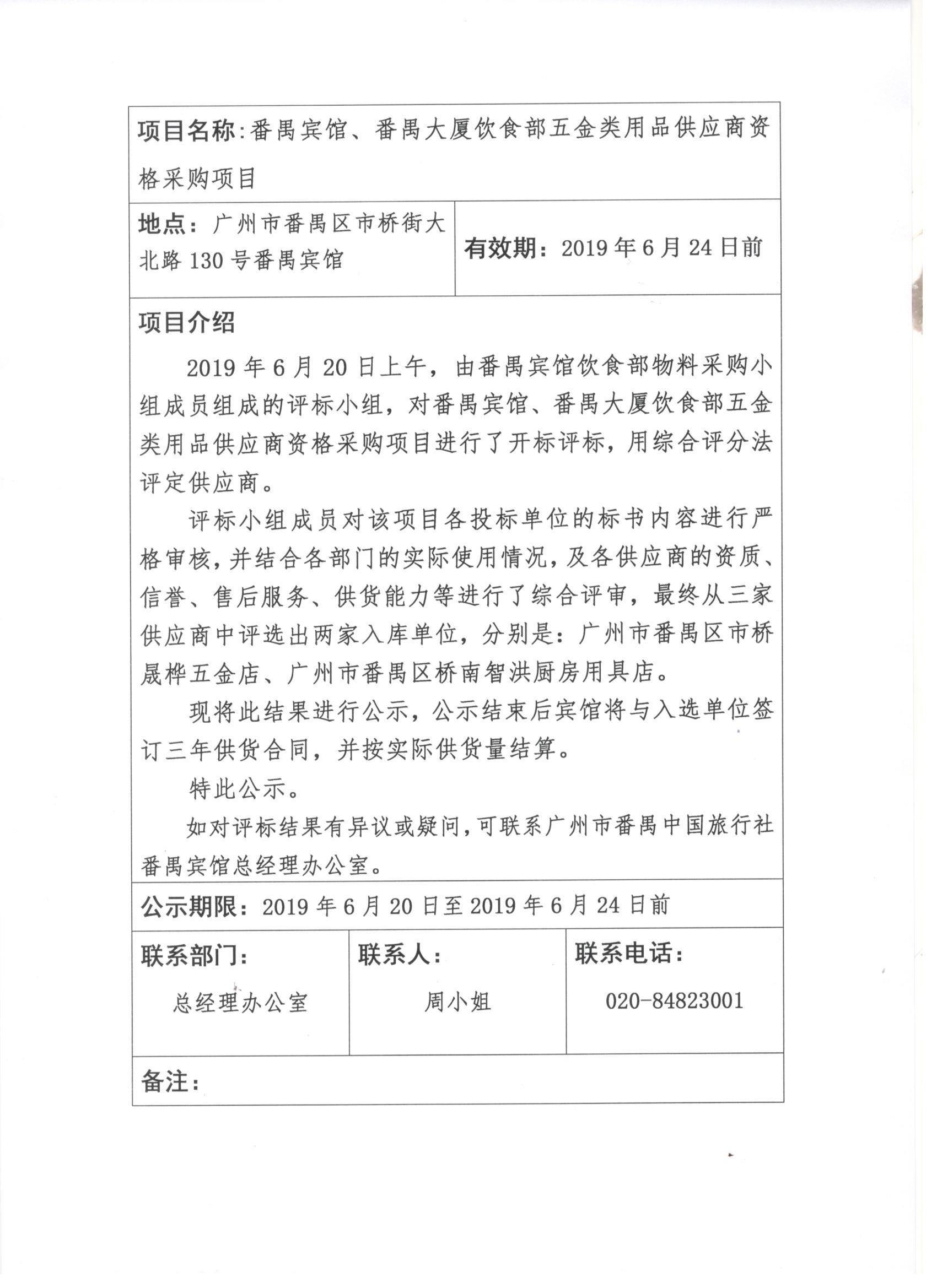 番禺賓館、番禺大廈飲食部五金類用品供應(yīng)商資格采購(gòu)項(xiàng)目中標(biāo)結(jié)果公示 發(fā)布日期:2019-06-20 分享: 下一篇: 番禺賓館、番禺大廈飲食部日用品供應(yīng)商資格采購(gòu)項(xiàng)目中標(biāo)結(jié)果公示 返回