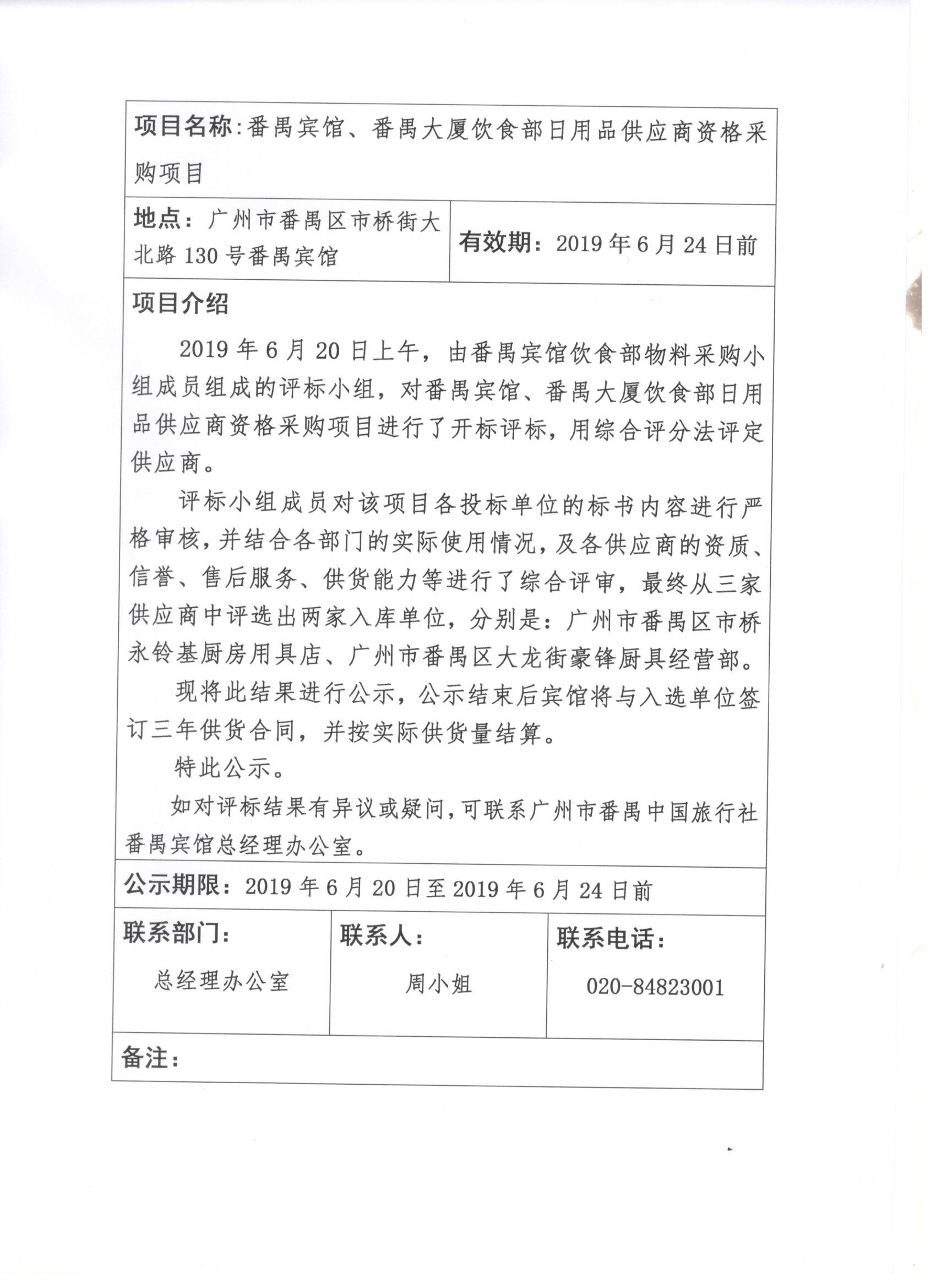 番禺賓館、番禺大廈飲食部日用品供應商資格采購項目中標結果公示
