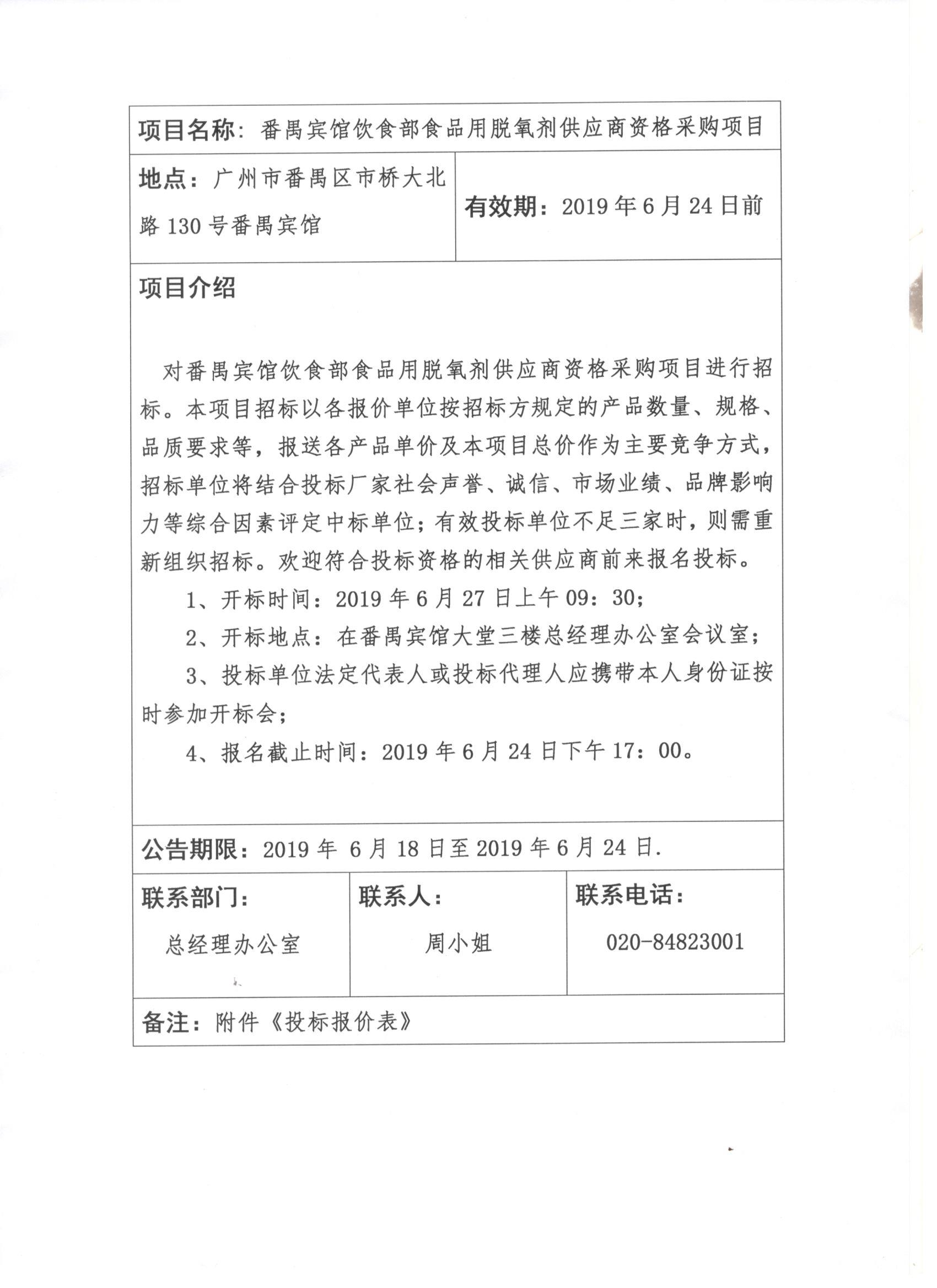 番禺賓館飲食部食品用脫氧劑供應(yīng)商資格采購項目招標公告 發(fā)布日期:2019-06-18 分享: 下一篇: 番禺賓館、番禺大廈飲食部五金類用品供應(yīng)商資格采購項目招標公告 返回